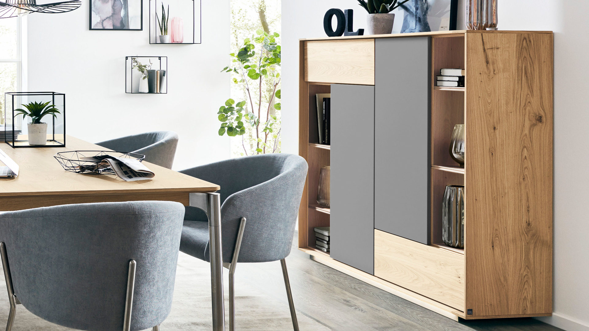 Interliving Esszimmer Serie 5602 Highboard Anthrazitfarbener Lack Helle Wildeiche Zwei Turen Eine Schublade
